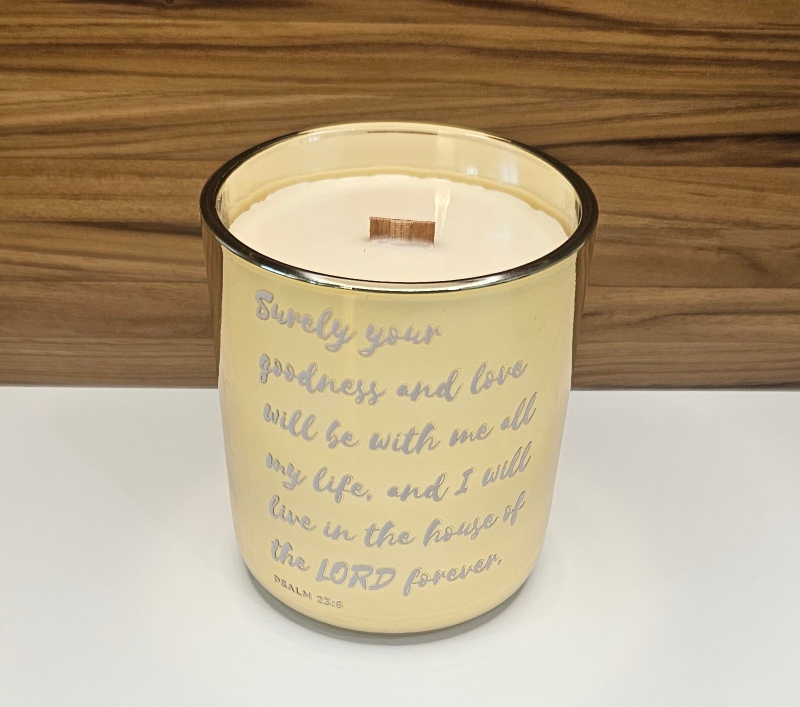More than a candle, it is an experience—inviting you into the presence of God and echoing the promise of Psalm 23:6: “Surely goodness and mercy shall follow me all the days of my life, and I will dwell in the house of the Lord forever.”